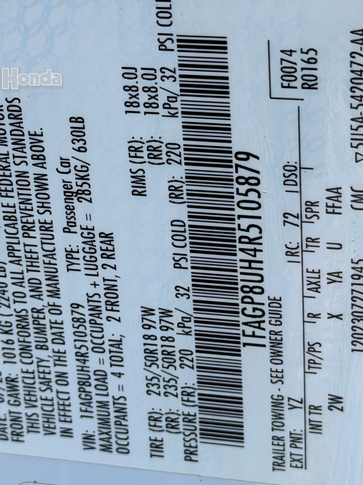 - VIN : 1FAGP8UH4R5105879