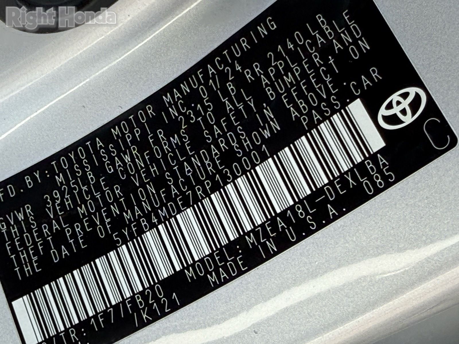 - VIN : 5YFB4MDE7RP130001