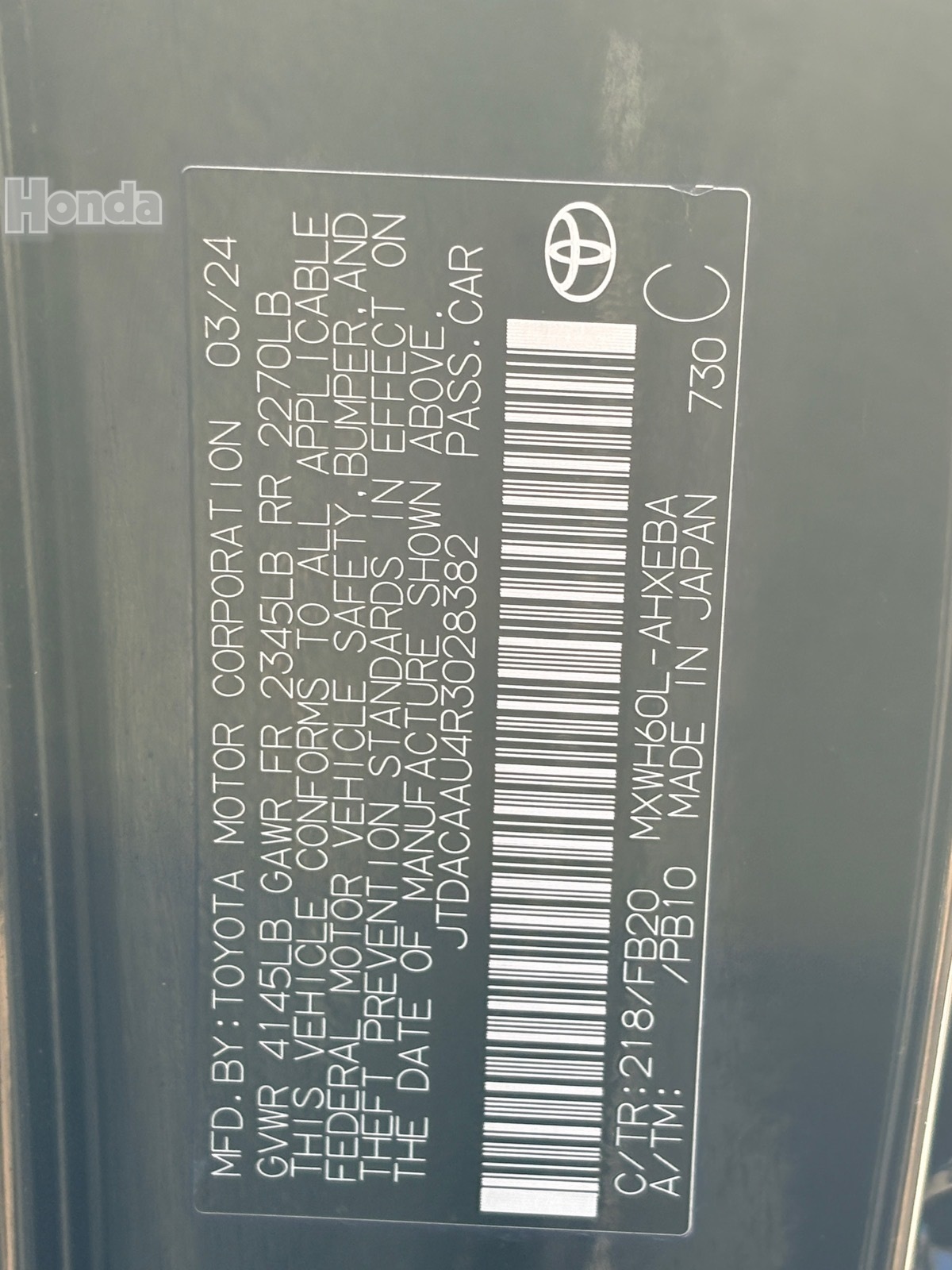 - VIN : JTDACAAU4R3028382