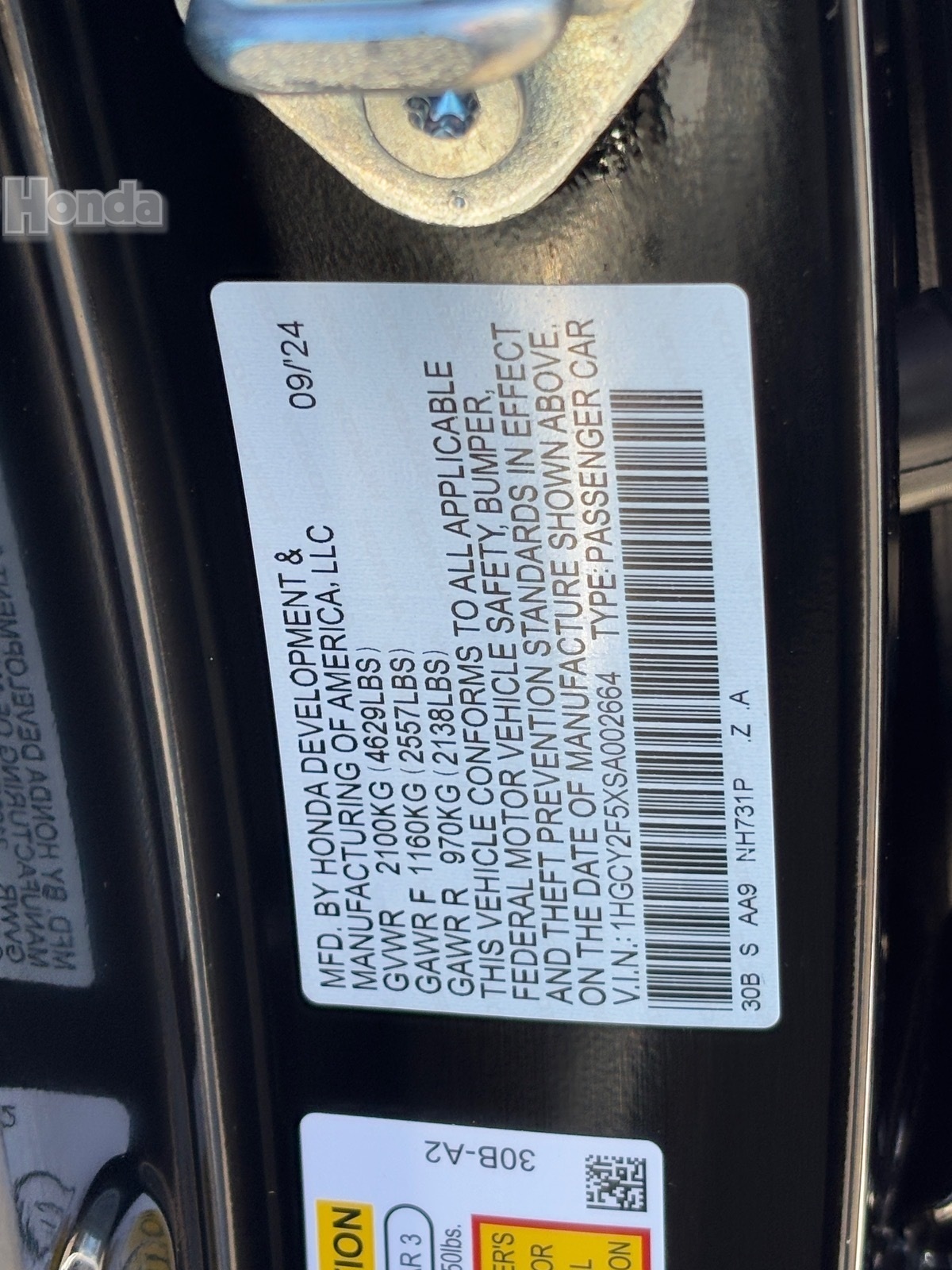 - VIN : 1HGCY2F5XSA002664