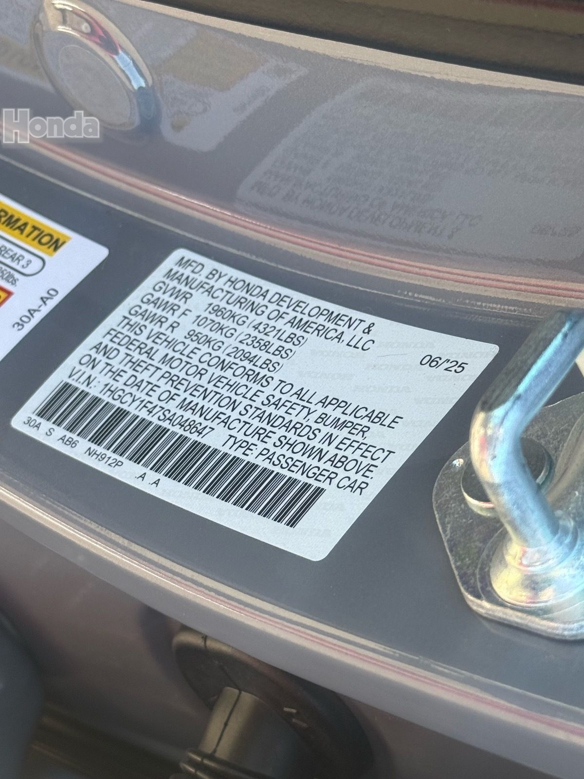 - VIN : 1HGCY1F47SA048647