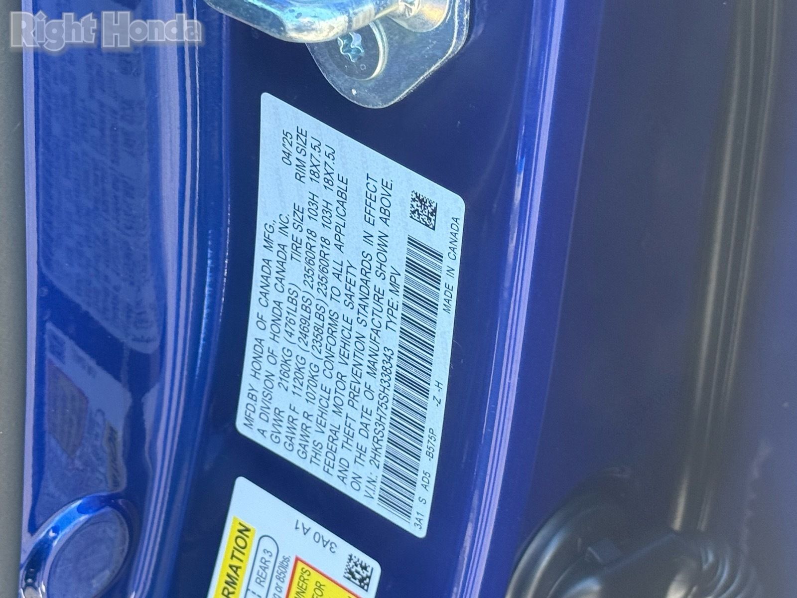 - VIN : 2HKRS3H75SH338343