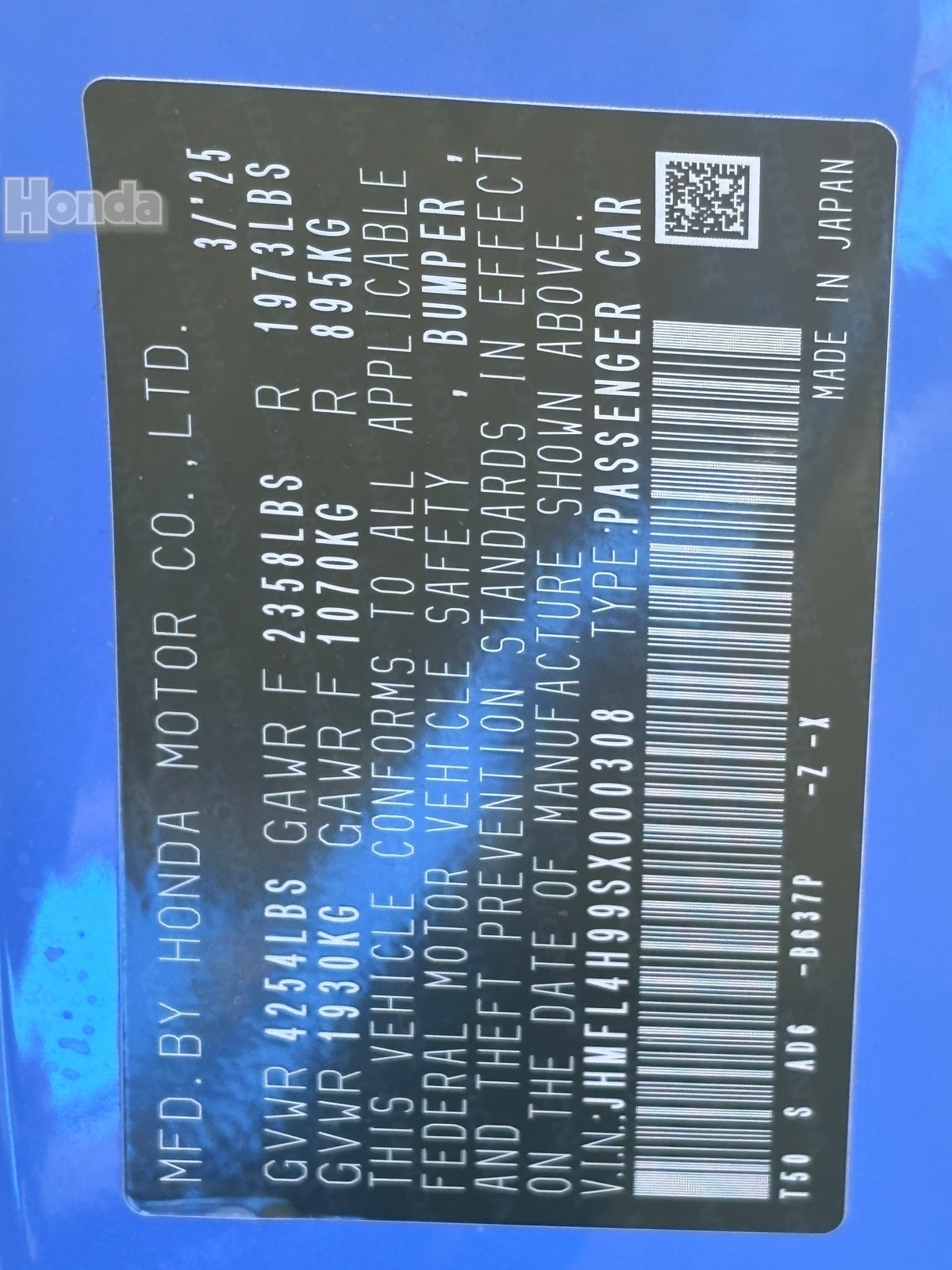 - VIN : JHMFL4H99SX000308