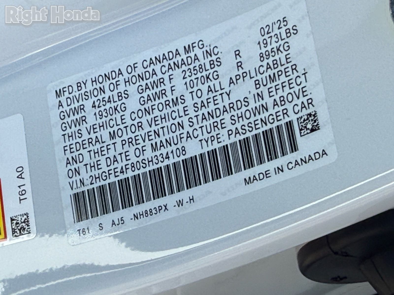 - VIN : 2HGFE4F80SH334108