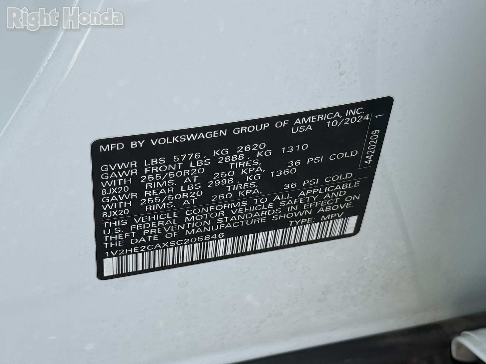 - VIN : 1V2HE2CAXSC205846