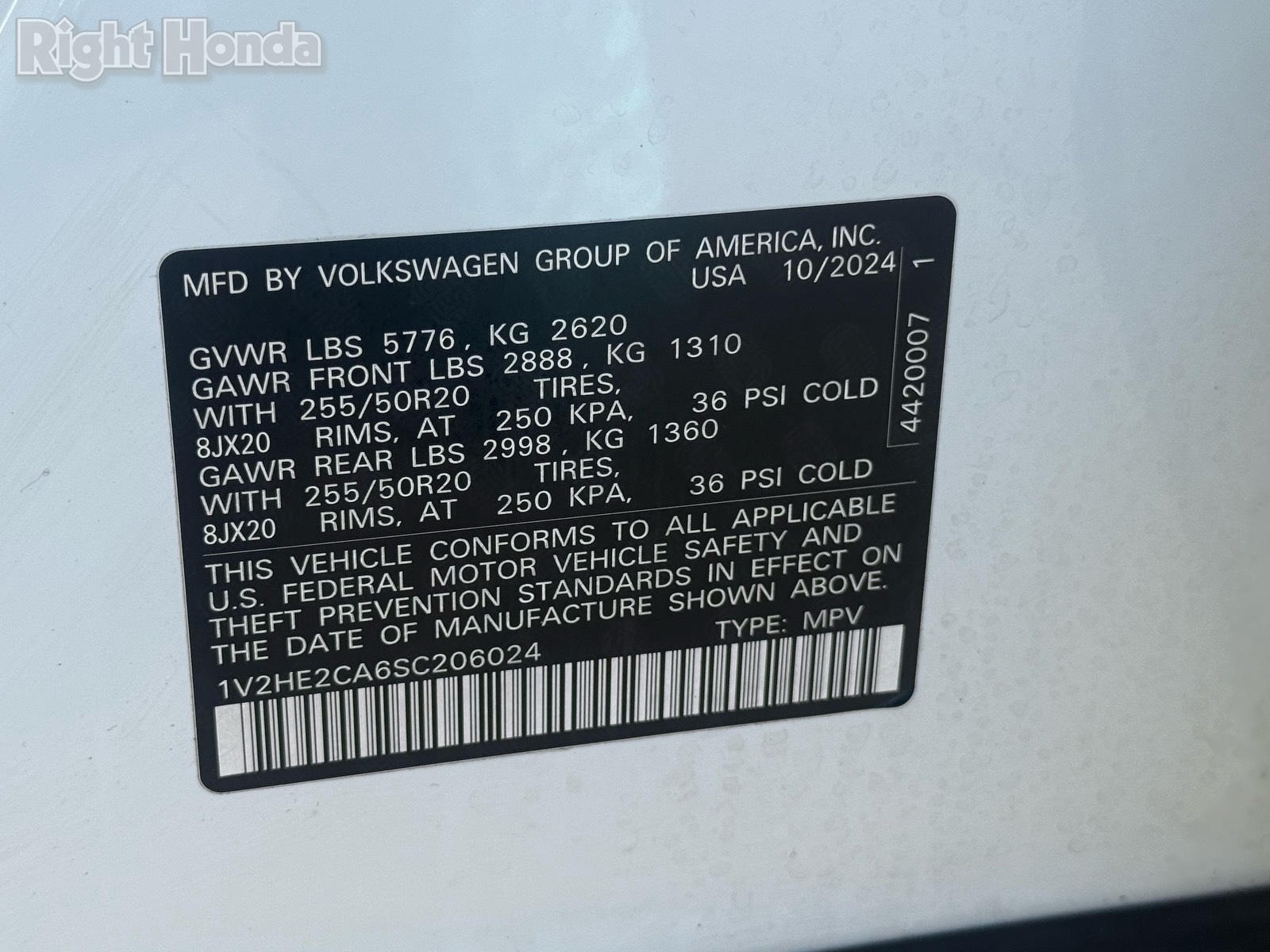 - VIN : 1V2HE2CA6SC206024