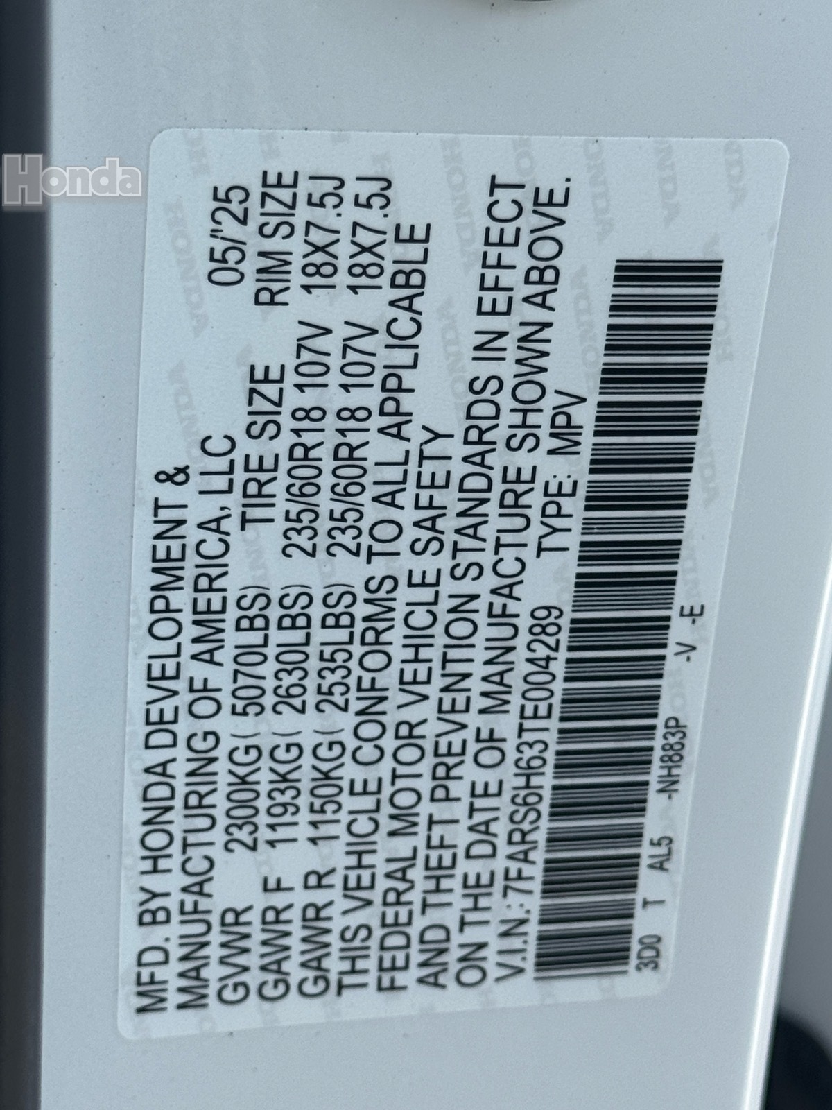 - VIN : 7FARS6H63TE004289