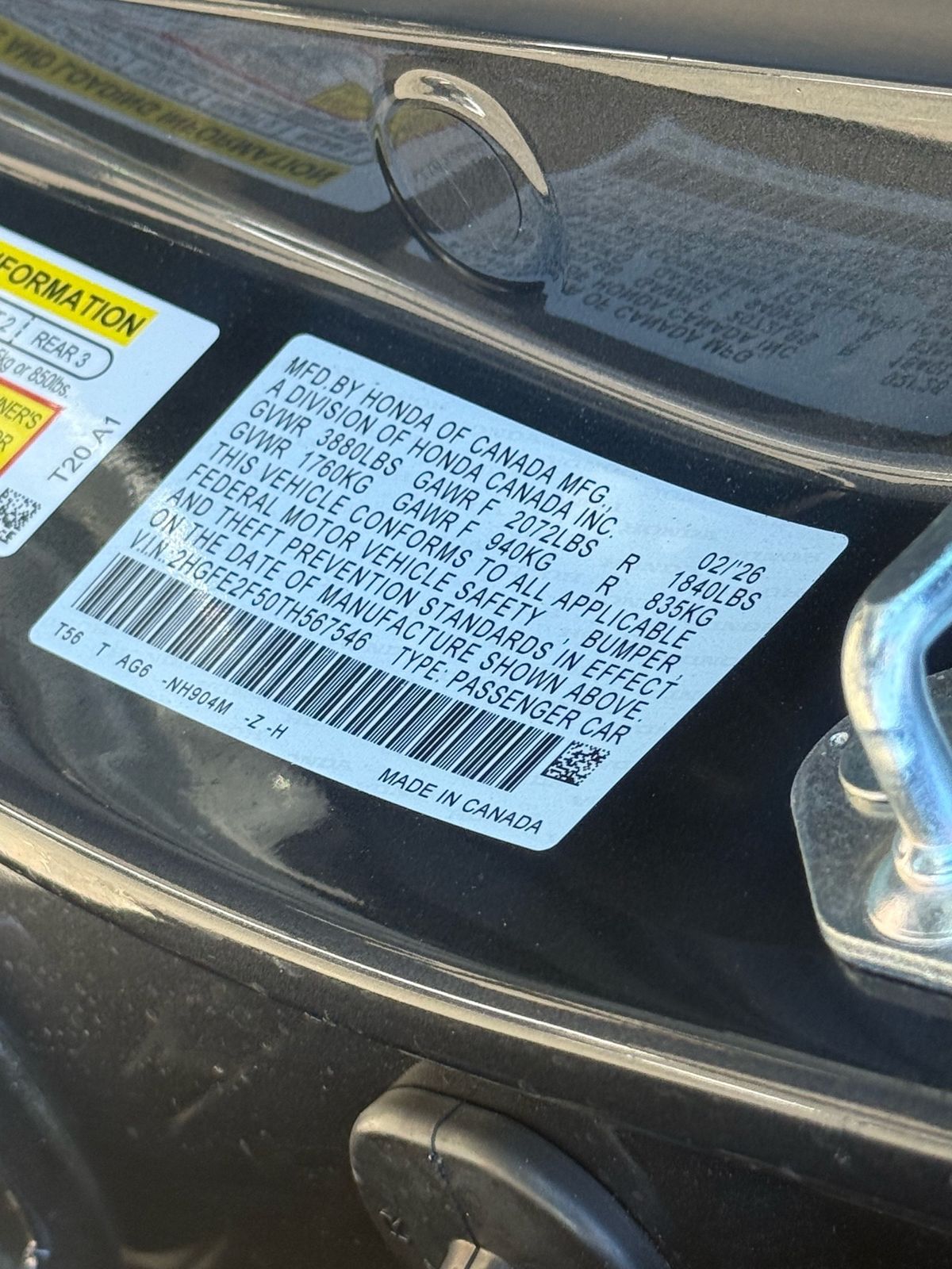 - VIN : 2HGFE2F50TH567546